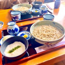こちらは珍しい!おしぼりそば 手前の白い濁ったお椀が 辛味大根の絞り汁たっぷり! ここに、信州味噌を溶いて お蕎麦を頂きます。 ザ、信州という味で美味しかったです!!