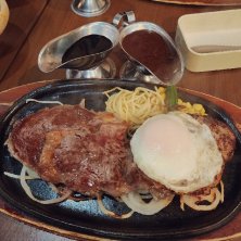 ◆MONSTER(300g) 2,387円(税込) いきなりステーキの「赤身! 肩ロースステーキ」300gと比較したくて初訪しました。 肉の量が同じ300gのはずなのになぜかこちらの方が多く感じました。 いきステは卓上置きの調味料が種類豊富ですが、ここはソースポットで提供され、5種類から選びます。 ライスはいきステはお替わり自由ですが、ここはお替わりは別料金と思われます。 サラダはいきステはランチセットで付きますが、ここは別料金です。 トータルすると甲乙つけ難く、あとは個々人の好みですね。