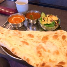 お昼にお蕎麦の準備をしていたら、突然ナンが食べたい🤤と彼ちゃん発信… 何食べたい?と聞いても常に何でもいーよ〜💧しか言わない彼ちゃん、自ら何が食べたいと言わない彼ちゃん。 常備菜作りも一段落していたので仕方ない、行きますか〜🚲💨 カレー2種にスープ、サラダ、ドリンクがついたBセットは¥950でナン又はライスがおかわり自由。 私はバターチキンとほうれん草の辛さ4に+¥300でチーズナンに🧀😝💕 ちなみにチーズナンはずっしりと重く、普通のナンはおかわり出来ますがギブアップ🙌