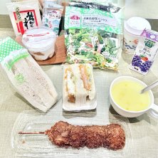 晩ご飯😃 ピクルス双葉店のサンドイッチ😋 かけそばのトッピング 浜田精肉店のコロッケ😋 小峰豆腐店のかき揚げ😋 からか〜ぜのホイップあんぱん😋