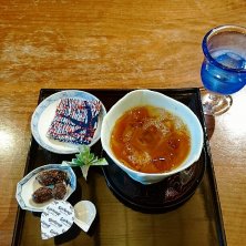 白玉あんみつ 古民家風のカフェ お花、服飾などのギャラリーも展開しているようです 引き戸を開けると「どうぞ、見ていってください」と… カフェ利用を伝えて靴を脱ぎ奥へ上がります ギャラリーのお客さんもいたようで案内されてました 他にもたくさんの和スイーツがありました 抹茶アイスが冷凍室から出されたばかりでかなり固かった 靴を脱いで畳の席に座り中庭を眺めながらのスイーツはやはり抜群でした ごちそうさまでした