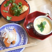 オニオンサーモン、茶碗蒸し、揚げ餃子