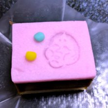 福は内 薄いこなしと練りじょうよで分厚い大島餡を挟んだ薄氷という和菓子と似たお菓子ですが、節分に併せてお多福の印が押され、全体の色は桃色に青と黄色の玉を配置し、華やかな色合いになっています。そして何よりも素晴らしいのは大島餡の美味しさです。餡の美味しさが際立ってます。