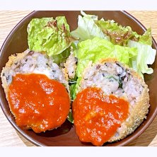 定食とどんぶりのチェーン店、大戸屋 ごはん処の期間限定メニュー、五穀米のライスコロッケ。五穀御飯、ほうれん草とチーズを包んで揚げたライスコロッケで、トマトソースとレタスが添えられた1品料理。他の期間限定メニューのチキンと6種野菜の和ポトフ定食のお供にオススメやったみたいやから試しに頼んでみた。味は美味かった。