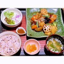 定食とどんぶりのチェーン店、大戸屋 ごはん処の期間限定メニュー、季節の野菜と豚と鶏つくねの黒酢あん定食 冬。ジューシーな豚肉と鶏つくね、季節野菜の黒酢餡に選べる御飯、味噌汁、サラダ、漬物とドレッシングがセットになった定食。御飯は白米か五穀米が選べるが、五穀米の方が好きやからこっちに。大戸屋の定食はやっぱり美味い。