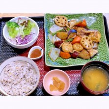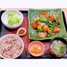定食とどんぶりのチェーン店、大戸屋 ごはん処の期間限定メニュー、季節の野菜と豚と鶏つくねの黒酢あん定食 秋。御飯は白米か五穀米が選べるが、やはり五穀米の方が好きなんで、こっちに。