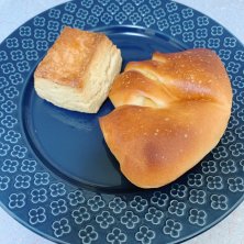 本日のお弁当 ⚫︎こくうの塩パン ⚫︎こくうのショコラデニッシュ ⚫︎パンだけじゃなく物足りなく、麦ご飯のシャケとちりめん山椒のおむすび