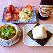 サウナめし。 今日のサウナめしは、名物どて焼き、厚切りベーコン、鮭のおにぎり、ビールです。