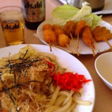 サウナめし。 ジムの後はサウナに移動。今日のサウナめしはスーパードライ、焼うどん、串揚げです♪