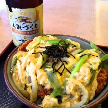 サウナめし。 今日のサウナめしは、かつ丼と大阪限定一番搾りです。