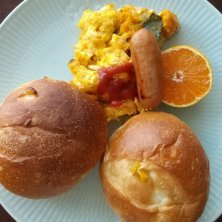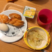 息子朝ごはん 今日の寝坊はドキドキしたー でも平らげて行きました!