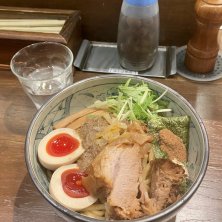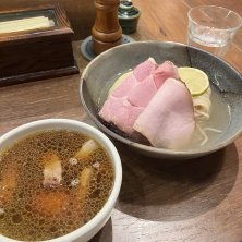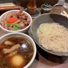 地鶏の昆布水つけ麺+チャーシュー(3枚) チャーシューは吊るし焼きのものといつものピンクのと選べます、とのことで 吊るし焼きですと?!イメージができるもののよくわからないけどピンクなやつを2枚と吊るし焼き1枚にしてもらってのこちら 結論、正解 いや逆であっても正解、美味 今日は店主風の兄さんの時間で やはり彼の手の丁寧さは明らかに違う 麺の筋が綺麗、締め方も輝きの違いで分かる 今回は9割素味と塩で啜った ライムが生姜のような風味な薬味のお役目 最後に昆布水で割ってつけ汁はデザートでした