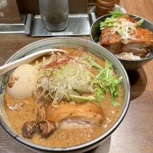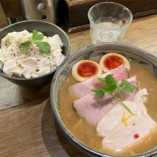 濃厚焦がし鰹らーめん 鶏のなんとか丼 隠れミッキーに偽ミッキー 濃厚だった、、地鶏と鰹のダブル 濃厚な鶏は時に舞台上に、否 豚以上に油脂感とコクを繰り出してくるから つらくなる瞬間もあるけど タルタルというかフレンチドレッシング風なさっぱりな鶏むねを途中に食べると いい感じで食べ進む スープを啜りおわって 最後にご飯もので口、あと味を整えるという 作った意図が見えそうな(勝手な推測)食べ方で ご馳走様でした これで4週連続の限定オンリー4種月間 (スタンプカード)達成! 年末の挨拶も