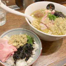 特製地鶏の昆布水つけ麺 景気良く特製、 味玉と海老ワンタンがトッピングされるらしい 今回は半分くらいそのままの味と藻塩で啜ってやったぜ あーしかし、 日曜担当のお兄さんは主力ベテランぽいけど いつものお兄さんの方が言葉、決まり文句の話し方、盛り付け方=麺の折り方、置き方なんかの 丁寧さが全然違う 平日また来よう