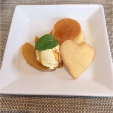 プリン、バニラアイス、りんごのコンポート