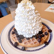 ららぽーと立川立飛店1周年Anniversary『Ekahi(エカヒ)パンケーキ』 価格:1,550円(税別) ブルーベリー菜園が盛んな立川をイメージし、ブルーベリーをふんだんに使用したパンケーキをご用意しました。ドライフルーツを入れて焼いたパンケーキは優しい甘みと食感が相性抜群です。更に、当店人気のホイップクリームに加え、ブルーベリーをたっぷり使用したクリーミーな味わいの“ブルーベリームース”と、バターの塩味がブルーベリーの甘みと風味を引き立てる“ブルーベリーバター”を添え