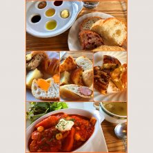 パン屋さんのランチ 本日のメインは豚ばら肉のトマトソース煮込み 分厚い豚ばら肉が3枚、柔らかくて脂っこさもなく食べやすくて美味しかったです(*´ω`*) 食べ放題のパンは、クラムチャウダーのデニッシュ、ホワイトチョコたっぷりのパン、塩メロンパン、モーンデニッシュが特にお気に入りでした! 付け合せの6種のソースにあるオリーブオイルの香りがとても良く、シンプルなパンに浸すとよく合いました!その他、塩バター、はちみつ、バルサミコ酢、アップルシナモン、ベリーのソースでもパンが楽しめました♡