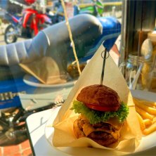 かねてより来てみたかったライダーズカフェへ🏍️ Bee Geesの「ブロードウェイの夜」が流れる米国ダイナーのような店内で サクサクバンズに挟まれたジューシーなパティのハンバーガーをいただきました🍔 自宅からこんなに近いならまた来よう♪