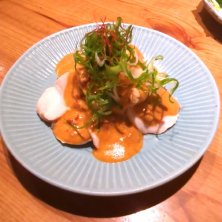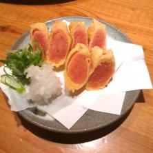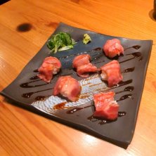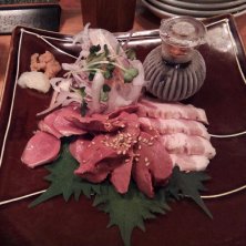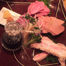 肉刺 1180円 奥から、タン、レバー、豚トロ。 タンと豚トロはニンニクと味噌を醤油に溶いて、 レバーはごま油で食べました。