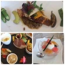 ランチのメインは、真鯛のポアレ 前菜は 生ハムとサラダ 淡路島玉ねぎのスープ エビのスパイス揚げ、ミニグラタン など お洒落な盛り付け デザートは、冬瓜のゼリーに西瓜、オレンジなど、サッパリ涼しげ^_−☆