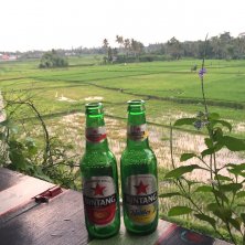 ビンタン・ビール、通常タイプのピルスナーとレモン風味のラドラー。風に吹かれて眺める景色が何よりのご馳走。