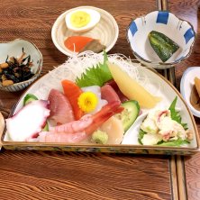 半年ぶりに訪問。消費税増税で値上がりしても安い❗️これに漬物、韓国海苔、デザート、お菓子がついてお刺身定食900円。右端に隠れている煮物が最高に美味しい。