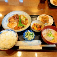 照り焼きチキン。 小松菜とえのきの生姜和え。 ワラビと油揚げの煮浸し。 菜っ葉のお漬物。 ワカメと油揚げのお味噌汁。 コーヒー付いて950円。