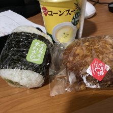 今日も某商店街のお手伝いで事務局ランチ。 デイリーヤマザキの新商品2つ。 安曇野産本わさびおにぎりとカリカリカレーパンをコーンスープで。 美味しい〜😋