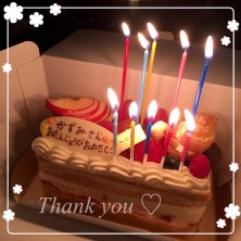 婿殿から、1日早いお誕生日ケーキをいただきました♡ ちゃんと、大5本 小5本のローソク付き。 これを撮った後、速攻で孫1号にローソクを吹き消され… チョコプレートとフルーツを食べ尽くされたけども (^^;; それでもやっぱり嬉しかった♡ Thank you (*˘︶˘人)