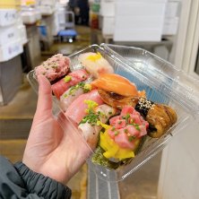 2日のランチ。 朝9時に門司港のルートインをチェックアウトし、前日趣の深かった路地裏を別ルートで散策した後、関門トンネル人道口まで歩き、関門トンネルをもちろん歩いてくぐり、山口県下関入り。そこからさらに歩いてたどり着いた唐戸市場。ここまで10,913歩。 めっちゃ美味しい寿司にありつけました。 巨大大トロ握り¥500 脳天¥300 炙りサーモン¥200 鯖¥200 大トロと脳天は人生で一番美味しかったかも。 唐戸市場、貝を焼いて食べさせてくれるお店がなかったのがちょっと残念でしたが、大満足。