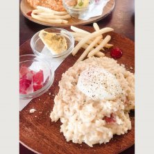カルボナーラ風リゾット★★★ 彼とリゾットカフェへ。 念願だった場所。 私の大好きなリゾット。味も大好きなカルボナーラだからダブルで幸せすぎました❣️ メニューも豊富でまた行ってみたいなあと。