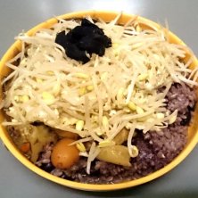 黒にんにく黒豆玄米もやしカレー カレーが大豆もやしで見えません(笑) 中には沢山の野菜、昆布や椎茸と、クコやヒマワリの種等の木の実が入ってます。 ココナッツ粉末でほんのり甘さも。 こんなのをワンコインで出しています❗ 自然食は自宅で作る通常のホームメニューだと、その参考にと出してますよ~✌
