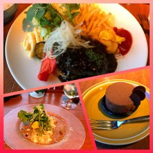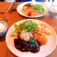 ハンバーグ♡ 近所のお洒落な洋食屋さん(*´ω`*)やっと行けた☆ ハンバーグめっちゃ美味しい♪( ´▽`)あとシェアしてステーキも食べた☆カレーも食べた。笑 窓辺の席で外の緑もよく見えてなかなか素敵やった(*´꒳`*)景色はただの道路やけど(・∀・) グラスワインとケーキでお祝い♡