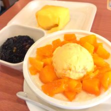 芒果梦幻雪双皮奶、芒果班載、黑糯米 手前はミルクカスタードプリンにマンゴーとアイスが載ったもの☺️ 奥はマンゴーと生クリームをクレープ生地で包んだもの。 左は黒米?よく分からないけど、現地の人達は好きっぽい☺️ どれも甘過ぎず美味しい☺️