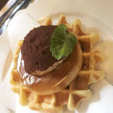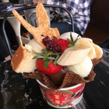 マンゴーアイスパフェ 上の赤いところが、梅? なにかかたくて噛めないものがはいってる。