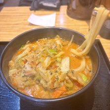 ◆イタリアンちゃんぽんカレーうどん1,140円 つるもちうどんにトマトの酸味が効いた優しい風味のカレーうどんにクラッシュトマトとトマトと野菜がたっぷり、アサリと小エビが入っています。