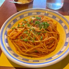 ◆トマトとベーコンのアマトリーチェ1,100円 少し酸味あるトマトソースに絡んだスパゲッティ クラッシュしたトマトとベーコンが入ってシンプルながら美味しい ランチにはサラダorスープが付いています。