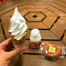 オヤツにヤギミルクとヤギミルクソフトクリーム おまけに焼きドーナッツヤギホエー