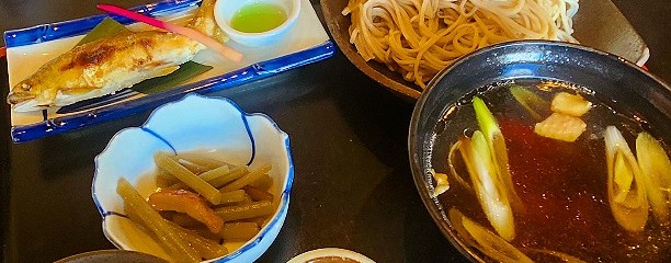 会津地鶏つけ蕎麦、鮎の塩焼き、鮎めしのセット♥
