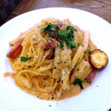 長芋とベーコンのコチュジャンクリームパスタ🍝 クリームパスタにコチュジャン? 辛いの得意じゃないので、大丈夫か?と思いながら。 豆板醤ほど辛くないからOK💡 たまにはこういう変わりダネクリーム系も良き♡