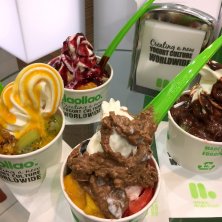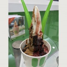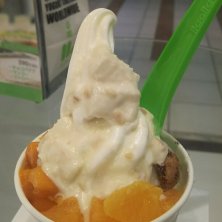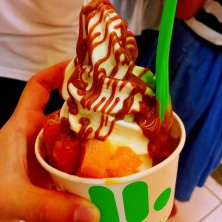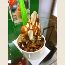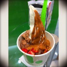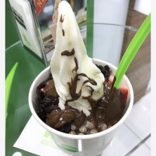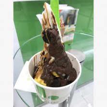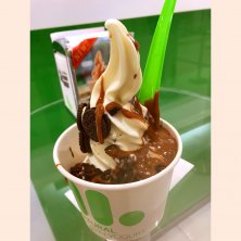 友達の誕生日祝いランチだったの。お昼の後はここへデザート食べに♡ヨーグルト味でトッピングは選べるの。みんなそれぞれ色々な組み合わせで頼んだけど、私のは店員さんが全てをチョコで包み隠してしまったの。盛り付けって大事よねー。味はとっても美味しかったよ♡