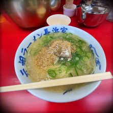 博多に来たらやっぱりラーメンだよね。 現地の人に連れて行ってもらったのは、 元祖ラーメン長浜家。 予想していたよりあっさりして美味しかったよ。 ラーメン450円に替え肉100円。 いいね!