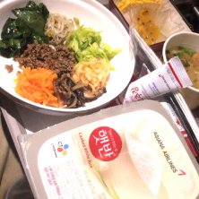 仁川→関空の間の機内食。結構食べ歩いたのに、何故かお腹空いてたので普通に食べられました。 これは全く凝ってなくて、ごく普通の機内食でした。どんなメニューでも、必ずコチュジャンが付いてくるのが面白い。