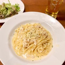 今日はみおさんの学園展で朝から出。 お昼は遅めにイタリアン。 ・自家製ドレッシングのサラダ ・生ハムとガーリックトースト ・鶏ひき肉とキャベツのクリームパスタ ・ドルチェ/エスプレッソ
