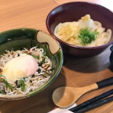 とり天温玉ぶっかけ*温かいのん☆ 温玉にお箸入れてトローリ。 熱々の茹で上がり麺にからめたら、釜玉みたいになった♪ モチモチ麺で美味しい~(*´∀`)