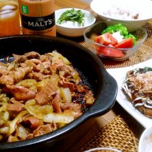晩御飯~ 地元柳屋食堂のとんちゃん❤ 青じそ奴 サラダ お好み焼き モルツ~ ピリ辛な 豚のもつ~ ビールが あまり得意で無い 私と旦那で 半分こ❤ 美味しい!(≧∇≦) 1日バイトの 疲れが 飛びます~(^^)d