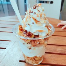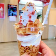ゴルフ⛳️2日目。 雨が降るかも、の予想に反して風もなく、いい天気の中ラウンド出来ました😀 ラウンド終わってから、途中の道の駅でお買い物しながらのひと休み。 ワッフルパフェ、ワッフルふわふわで🍓のアイスに🍓 のソース。🍓の季節はテンションあがります💕😍