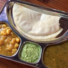 バリ島ウブドのインド料理店 Tulsi。ポテト、ダール豆、ココナッツ。半円形はドーサ。ナンよりは薄く、クレープよりは厚い。50000ルピア(約400円)。美味しい。