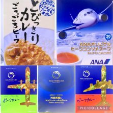 ANAグループのお土産店、ANAフェスタで購入したカレー類とスープ。 中身は、 ・上段左→とびっきりカレー ごろごろビーフ。 ・上段右→ANAオリジナルビーフコンソメスープ。 ・下段左→ANAファーストクラスシェフ監修のポークカレー。 ・下段中→ANAファーストクラス 阿波尾鶏とマッシュルームのカレー。 ・下段右→ANAファーストクラスシェフ監修のビーフカレー。 です。 ANAフェスタのホームページはこちら。 https://www.anafesta.com