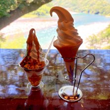 午前中は仁淀川上流へ。 にこ淵という所は、かなり綺麗なコバルトブルーの湖! 飛び込みたくなりました。 こちらは、高知アイス売店という、そのまんまの名前のスイーツ屋さん♩⁽ ◟꒰⑅°͈꒳°͈꒱◞ ⁾⁾ 川を眺めながら、土佐ジローソフトとミレーアイスを。子供とはアイスの取り合いになるので、落ち着いて食べれませんが、素敵な雰囲気でした♩